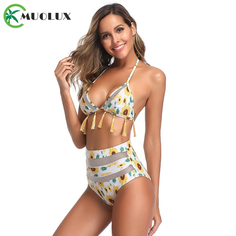 | MUOLUX 2020 sexy Tankini Swimsuit split Tassel Mesh Swimwear Women High Waist female retro Vintage Bathing Suit print bikinis |