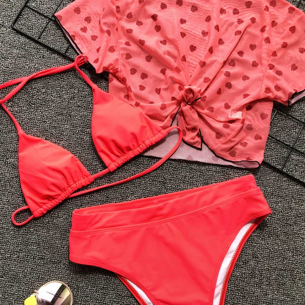 | 3 Pieces High Waist Bikini 2019 New Mesh Push Up Swimwear Women Bathing Suit Red Sexy Swimsuit Female Bathers Print Biquinis New |