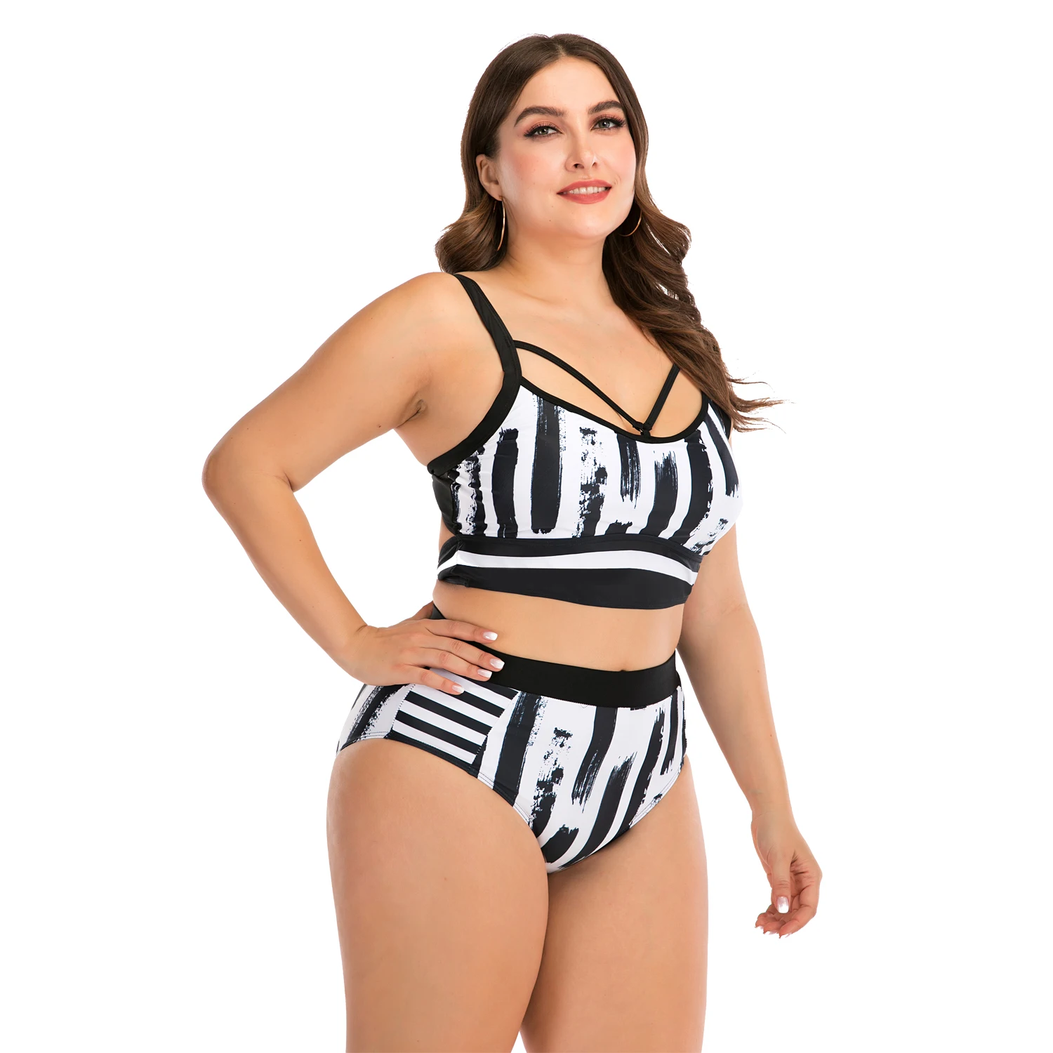| Lunamy 2020 Black&White Stiped Bikini Set Women Plus Size Swimwear High Waist Two Piece Swimsuit Big Size Biquini Bathing Suit |