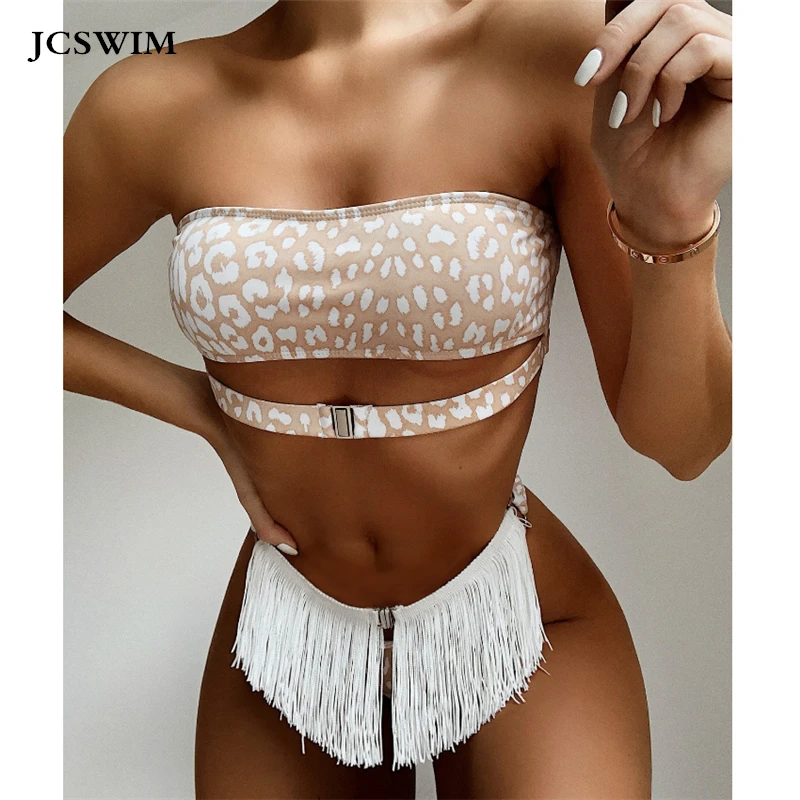 JCSWIM Leopard Print Bikini Mujer 2020 New Sexy Tassel Swimwear Women Push Up Summer Beachwear Bandeau Swimsuit Women Two Pieces