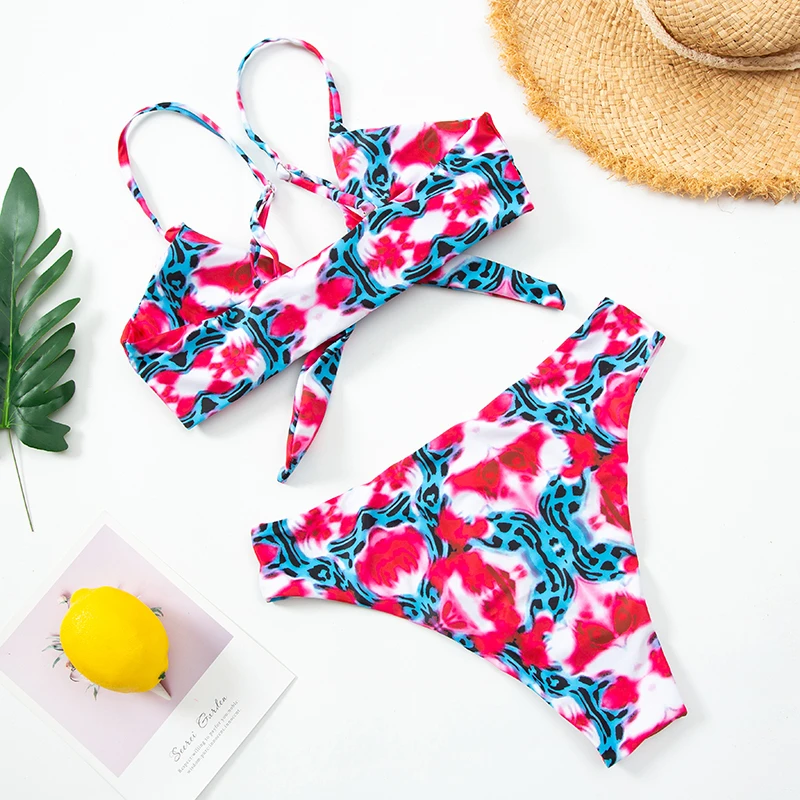 Two Piece Swimsuit Swimwear Women Sexy Criss Cross Strap Hollow Out Pad Backless Swimsuit Print Bathing Suit