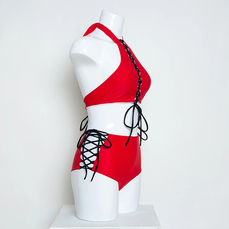 | Sexy Red Bikini High Waist 2020 Summer Bandage Swimsuit Mujer Lace Up Solid Swim Suit Cut Out High Neck Swimwear Bathing Suits |